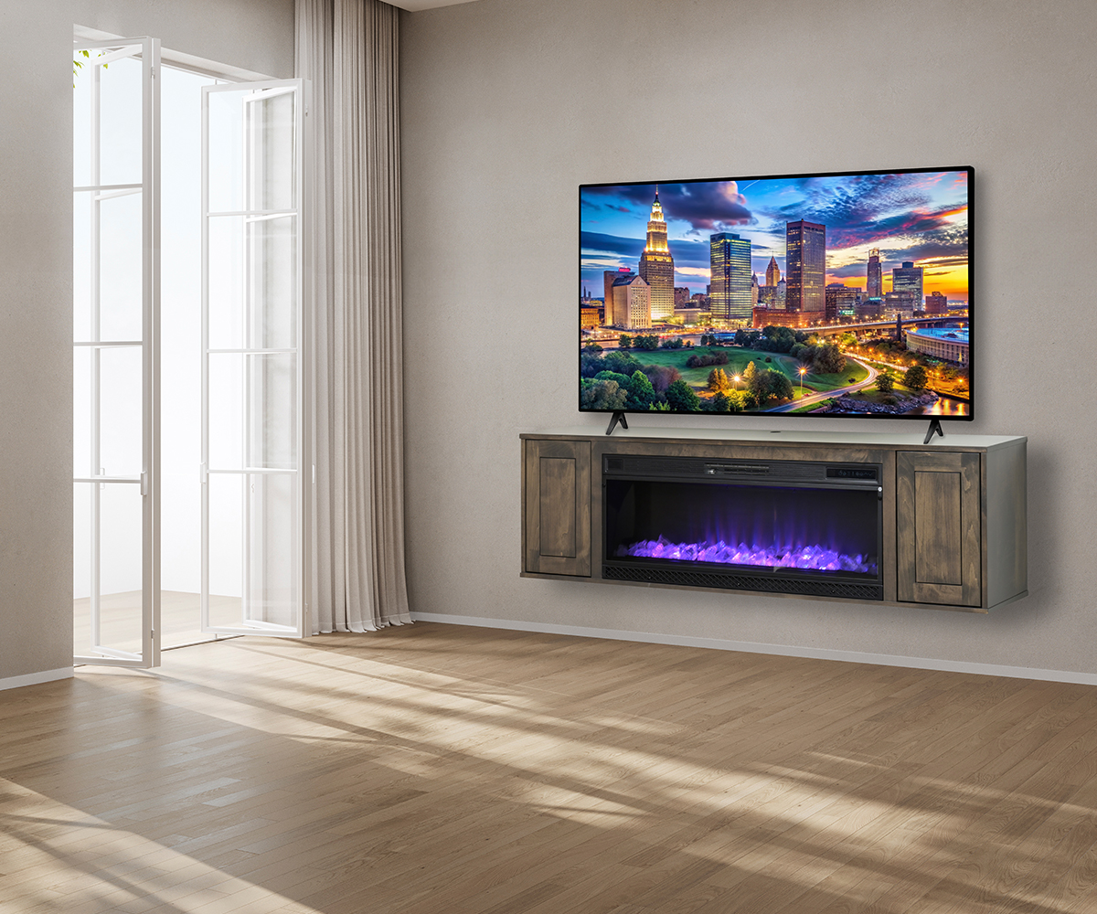 Features: • TV stand mounted to wall • Fireplace insert in center