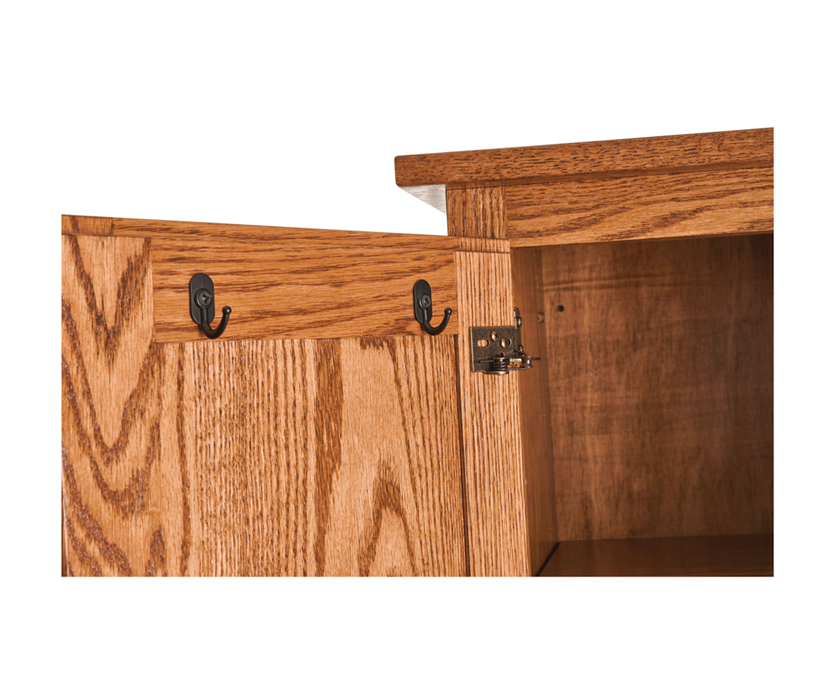 Features: • Mirror on one side • Door on the back • Small hooks behind door • Five wood shelves behind door • Large hooks on opposite sides