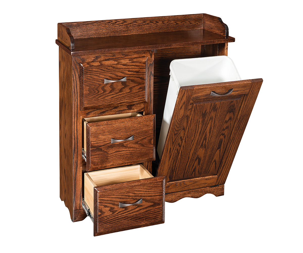 Features: • Dovetailed drawers • Full extension drawer slides • A 50 qt trash can fits inside • Front panel tilts forward for easy access